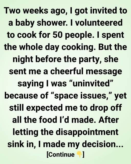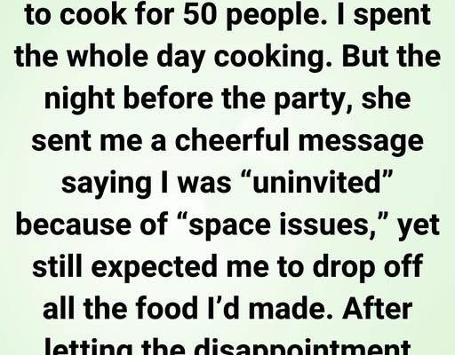But the night before the party, she sent me a cheerful message saying I was “uninvited” because of “space issues,” yet still expected me to drop off all the food I’d made. After letting the disappointment sink in, I made my decision… I decided kindness should never be taken for granted, and neither should effort. I messaged her back politely, thanking her for the invite and wishing her a wonderful celebration.