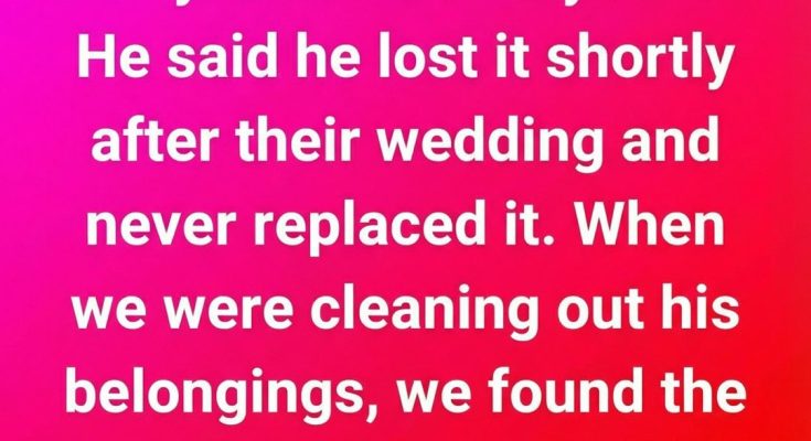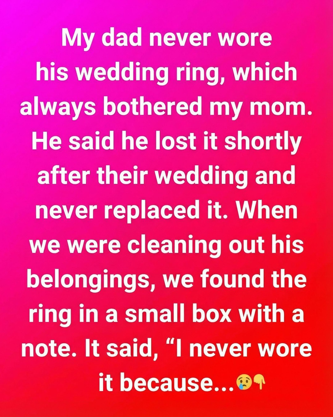 My dad never wore his wedding ring, which always bothered my mom. He said he lost it shortly after their wedding and never replaced it. When we were cleaning out his belongings, we found the ring in a small box with a note. It said, “I never wore it because…” he feared damaging it during work. My dad spent most of his life doing physical labor—building fences, repairing engines, lifting equipment. His hands were always calloused, always moving, and always at risk of getting caught on something sharp. He used to joke that his hands were his tools, and tools shouldn’t wear jewelry. Still, we had all believed the story about the ring being lost. Seeing it tucked away so carefully, wrapped in a soft cloth, felt like uncovering a quiet truth he’d chosen not to burden us with.