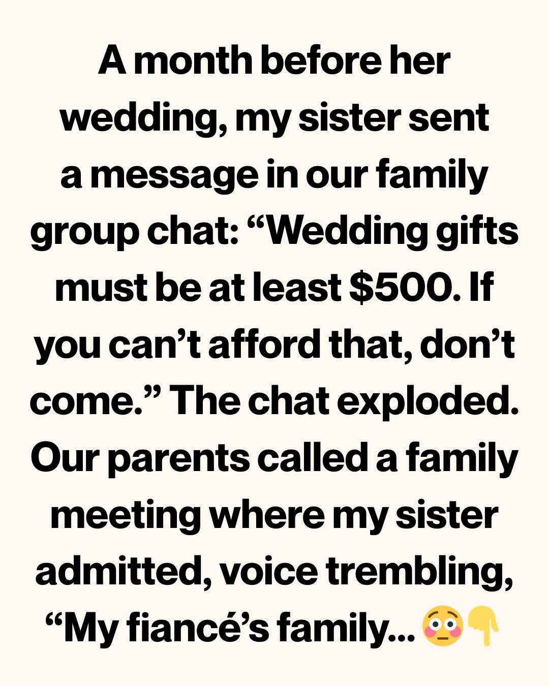 A month before her wedding, my sister dropped a grenade into our peaceful family group chat. Out of nowhere, she sent a long message that ended with the line: “Wedding gifts must be at least $500. If you can’t afford that, don’t come.”