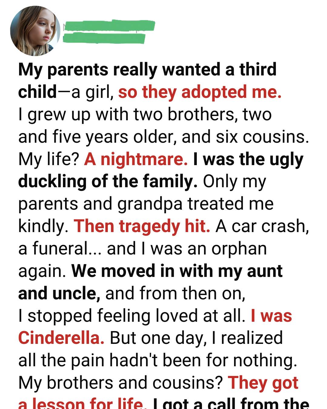 They told me I was chosen, special, wanted. And for a time, I believed every word. I grew up with two older brothers and six cousins who orbited our home like a loud, glittering universe.