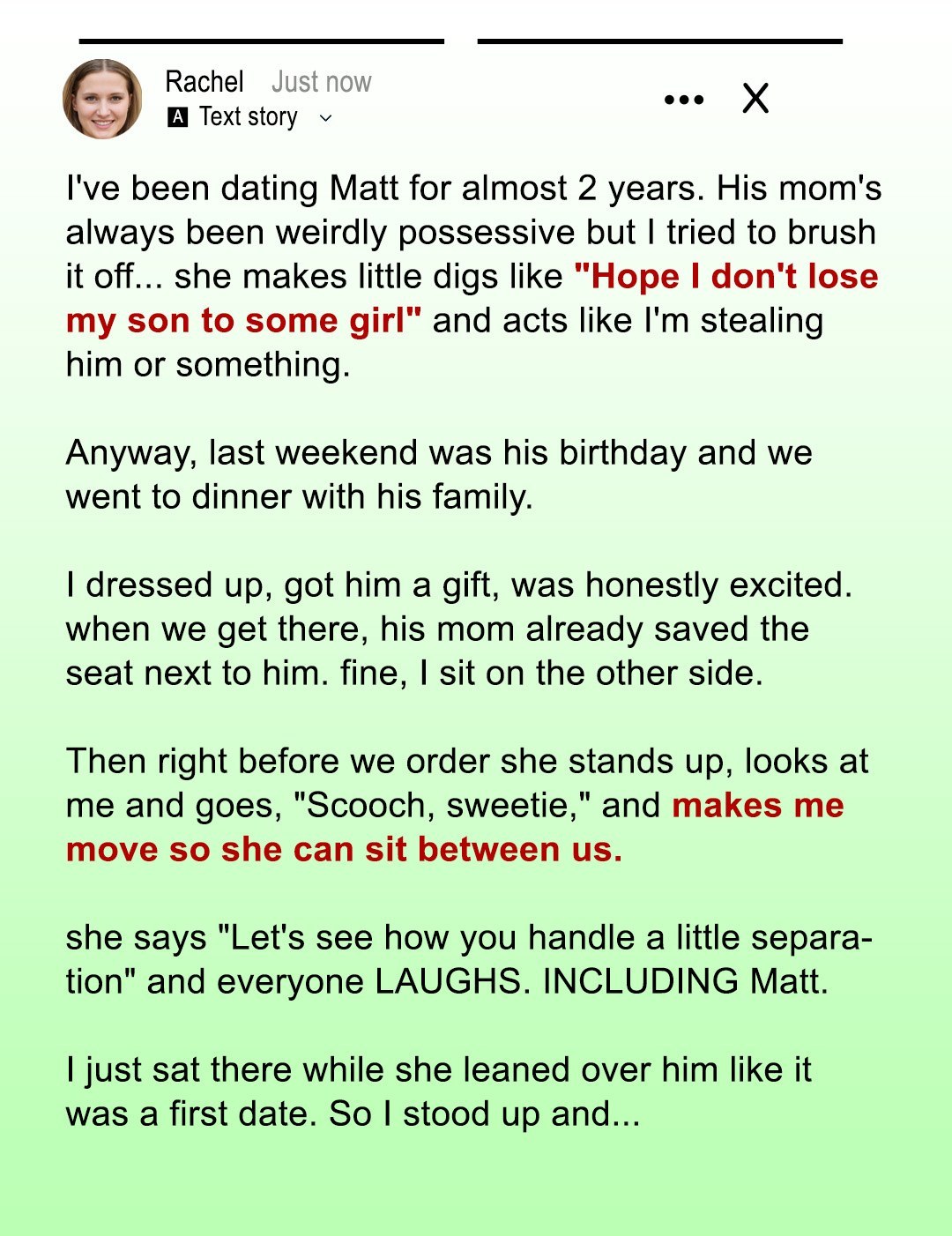 But I didn’t understand just how close—until that one night at dinner, when I found myself sliding quietly down a restaurant bench while his mother sat next to him, grinning like she had just won a prize. That night, a simple dinner reservation turned into a clear message: I was never the main person in his life. Matt and I had been dating for almost two years.