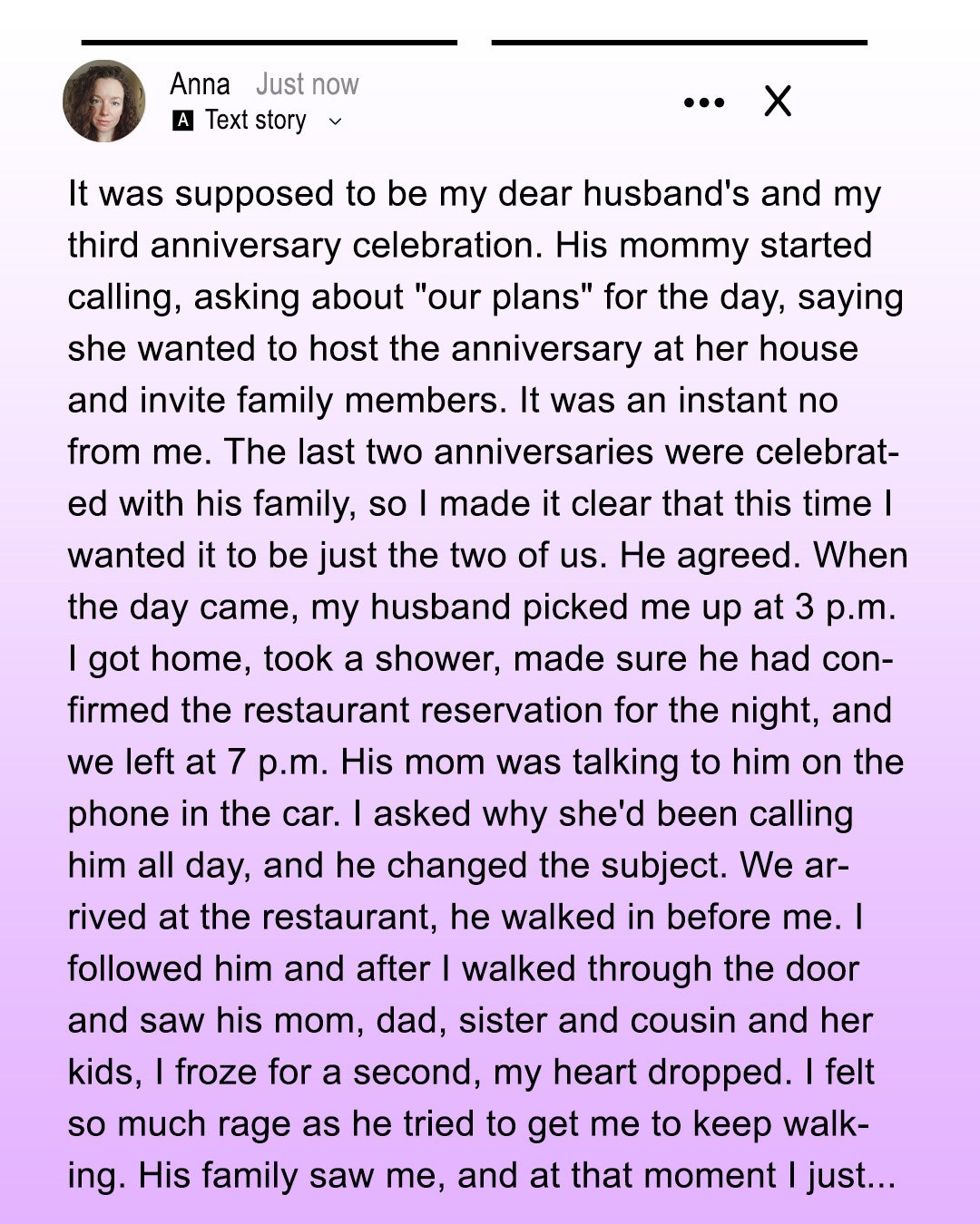 My Husband Secretly Invited His Whole Family to Our Anniversary Under His Mom’s Influence — So I Made Sure He Regretted It