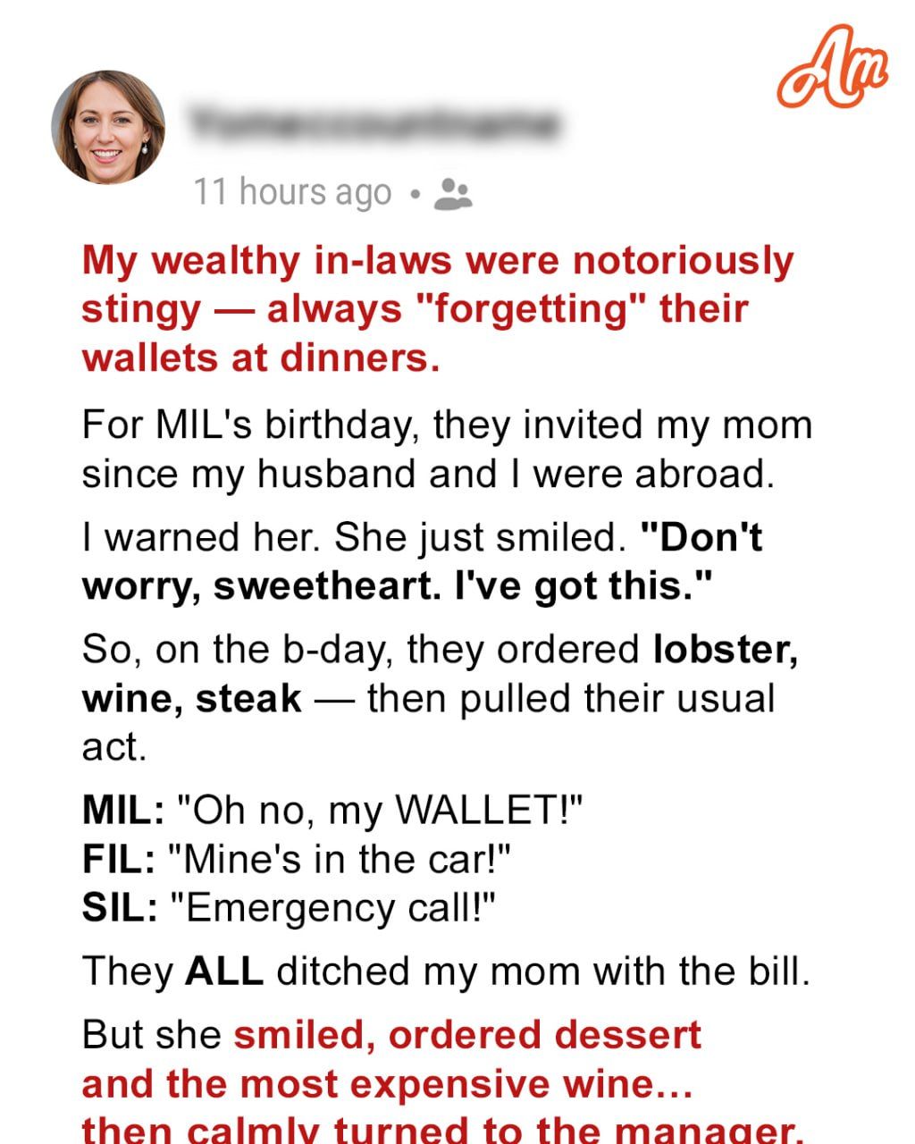 For years, my wealthy in-laws pulled the same trick: “forgetting” their wallets at dinner to avoid paying. When they invited my mom to a fancy restaurant, thinking she’d fall for it too, they had no idea she was ready. This time, their scam backfired… spectacularly.