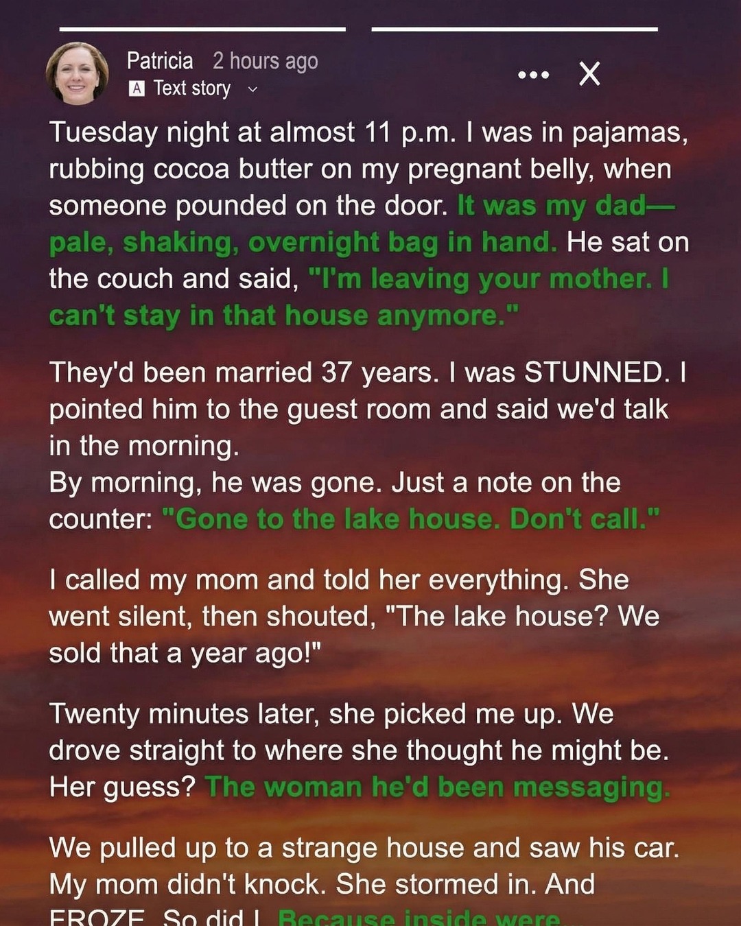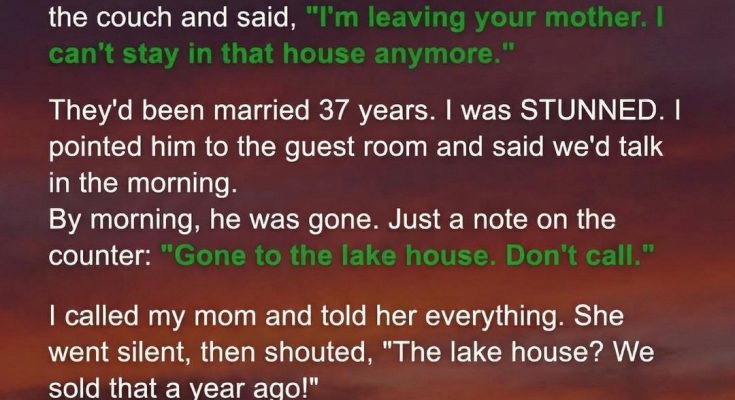 Tuesday night at almost 11 p.m. I was in pajamas, rubbing cocoa butter on my pregnant belly, when someone pounded on the door. It was my dad—pale, shaking, overnight bag in hand. He sat on the couch and said, “I’m leaving your mother. I can’t stay in that house anymore.” They’d been married 37 years. I was STUNNED. I pointed him to the guest room and said we’d talk in the morning. By morning, he was gone. Just a note on the counter: “Gone to the lake house. Don’t call.” His handwriting looked uncertain, as though he’d rushed to write the message. Something about it didn’t feel right, but I pushed the thought aside, telling myself he just needed space.