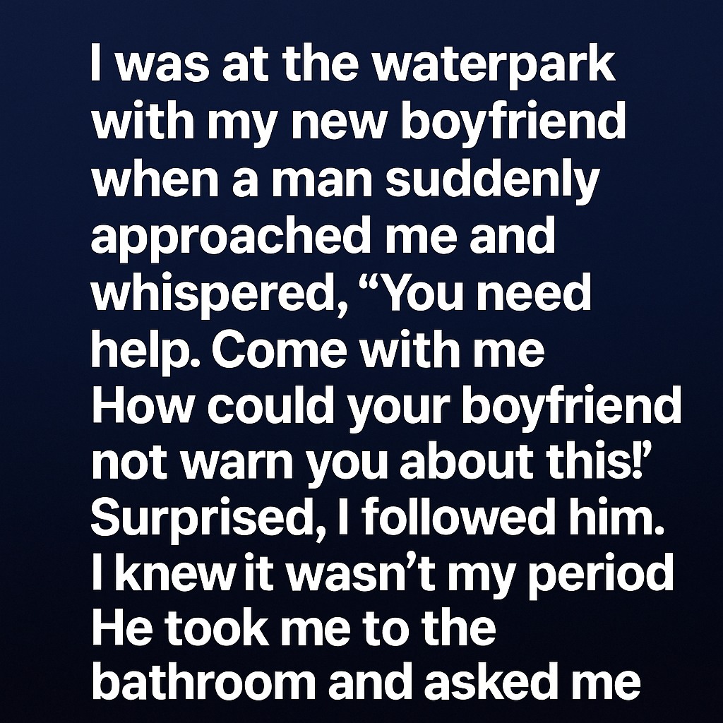 I was at the waterpark with my new boyfriend when a man suddenly approached me and whispered, “You need help. Come with me. How could your boyfriend not warn you about this!” Surprised, I followed him. I knew it wasn’t my period. He took me to the bathroom and asked me calmly if I had noticed anything unusual about my swimsuit. Confused, I stepped in front of the mirror and turned slightly. Only then did I see it—my entire back was streaked with bright, chalky blue paint. At first, I thought it was some sort of prank, but the man explained that one of the older water slides had a safety marker used by lifeguards to identify worn surfaces. Unfortunately, I had unknowingly brushed up against a newly patched area, and the paint had transferred onto me. It wasn’t harmful, but it did look startling from a distance. He had noticed the marks and didn’t want me to feel embarrassed walking around in front of the crowds.