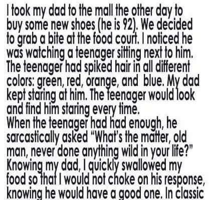 As we left the food court, my dad walked with the same quiet confidence he always had, his steps slow but steady. “You know,” he said to me, “people surprise you when you give them the space to.” I realized then that the moment wasn’t about a teenager’s hair or an old man’s past—it was about understanding that every generation carries its own ways of being bold. And sometimes, all it takes is a simple conversation to bridge years, soften judgments, and remind us that wisdom and curiosity can meet in the most unexpected places.