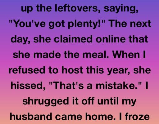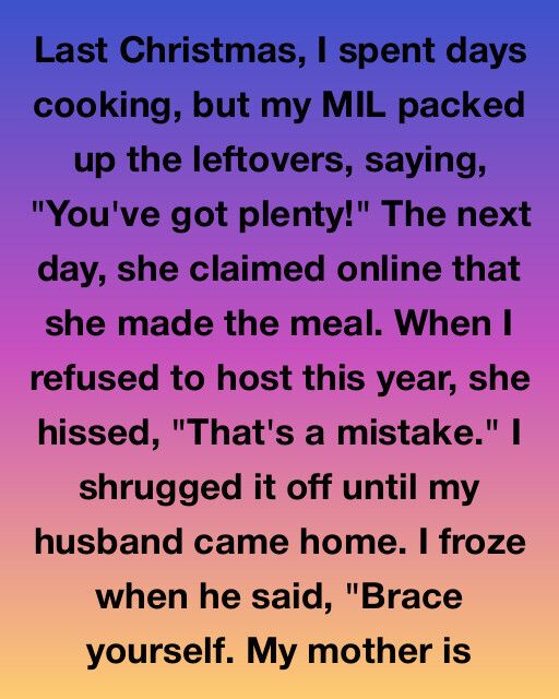 Last Christmas, I spent days cooking, and my MIL walked out with the leftovers, then posted online that she made the entire meal. So this year, I refused to host. The peace didn’t last—my husband came home looking defeated.