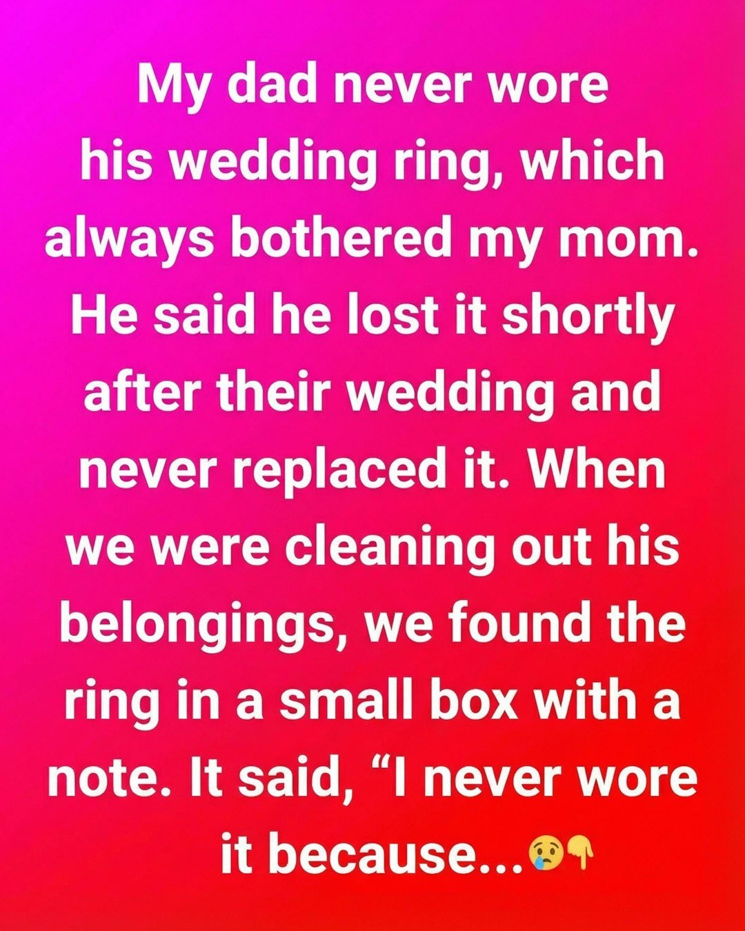 What we had always accepted as a simple story about a lost ring suddenly revealed itself as a deliberate and thoughtful decision. That moment felt like being invited into a private conversation he had chosen to leave behind, guided by love and concern. For years, my dad had explained that the ring went missing not long after the wedding.