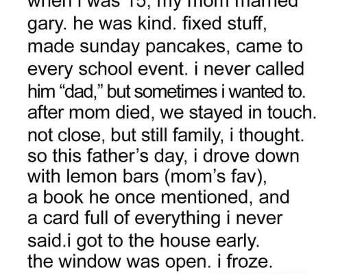 On Father’s Day, I drove six hours back to the house I grew up in, carrying with me a tray of my mother’s lemon bars, a carefully chosen World War II biography, and a handwritten card that took me ten years to write. I thought I was coming home to close a chapter. To finally thank the man who stepped in when my father stepped out.