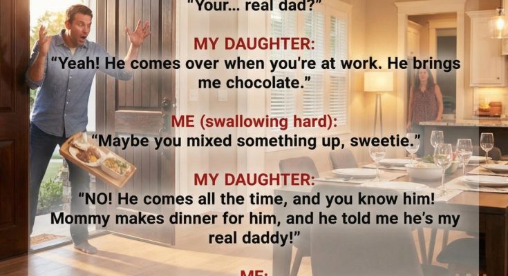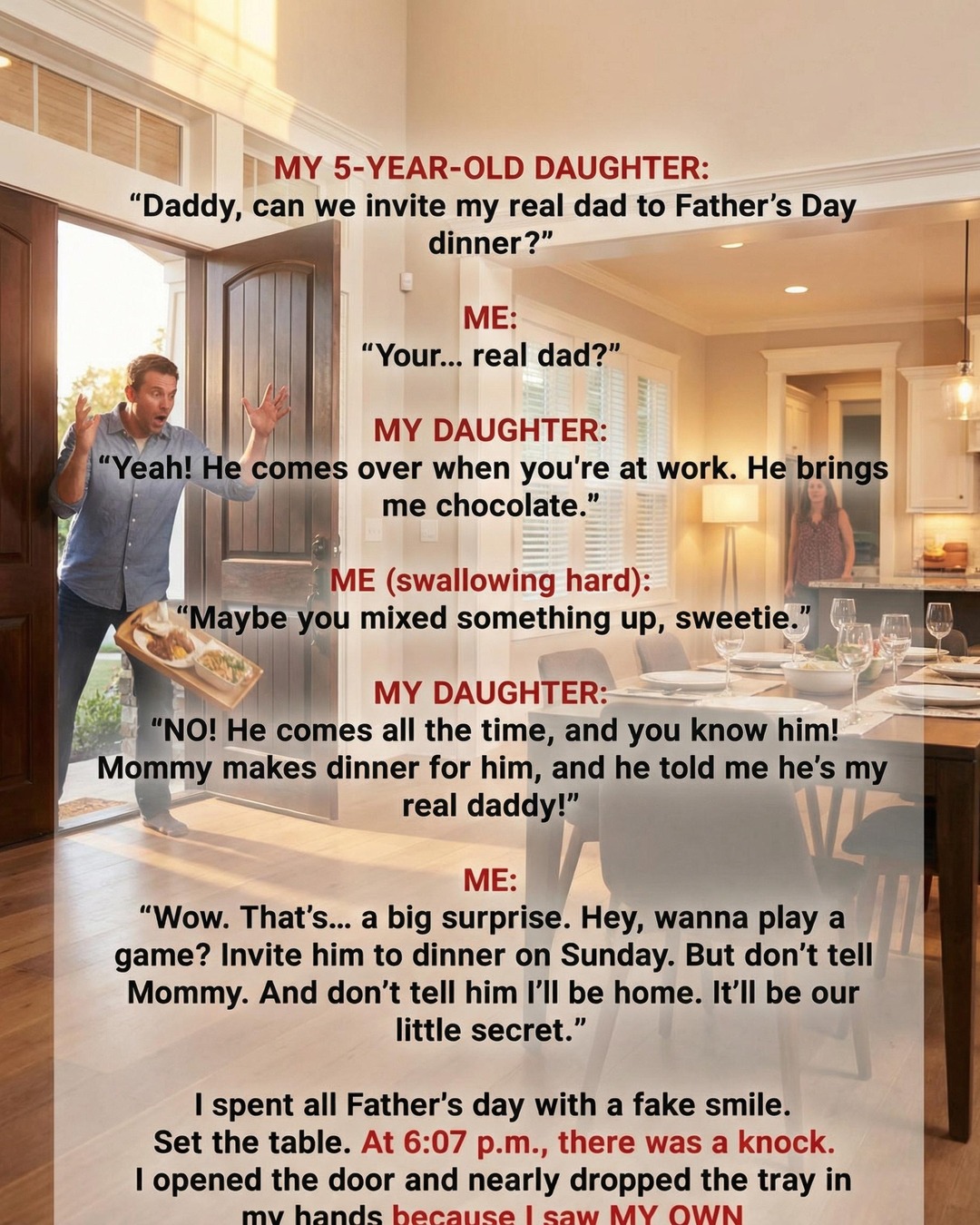 I spent all Father’s Day with a fake smile. Set the table. At 6:07 p.m., there was a knock. I opened the door and nearly dropped the tray in my hands because I saw MY OWN…”*…brother standing there, holding a bag of chocolates in one hand and a board game in the other. He froze when he saw my expression, clearly confused. Meanwhile, my daughter ran toward him shouting, “My real dad is here!” My brother burst into laughter—then quickly stopped when he saw my face. “Okay… I think we need to talk,” he said, stepping inside. As we all sat down, he explained that during the past few weeks, he had been stopping by to help my wife fix a leaky kitchen pipe and replace a broken cabinet door, things he hadn’t mentioned because they seemed small. My daughter, seeing him often during the afternoons, had created her own imaginative version of events.