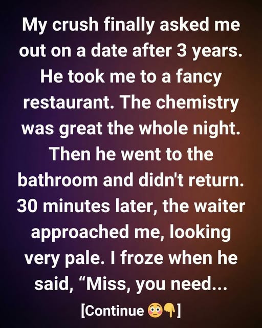 My crush finally asked me out on a date after 3 years.He took me to a fancy restaurant. The chemistry was great the whole night.Then he went to the bathroom and didn’t return. 30 minutes later, the waiter approached me, looking very pale.