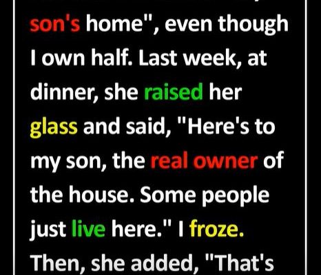 “Here’s to my son, the real owner of this house. Some people just live here.” I froze, but her speech got worse. “You know, as the mother of the homeowner, I think it’s only right that I have my own set of keys. What if there’s an emergency?”
