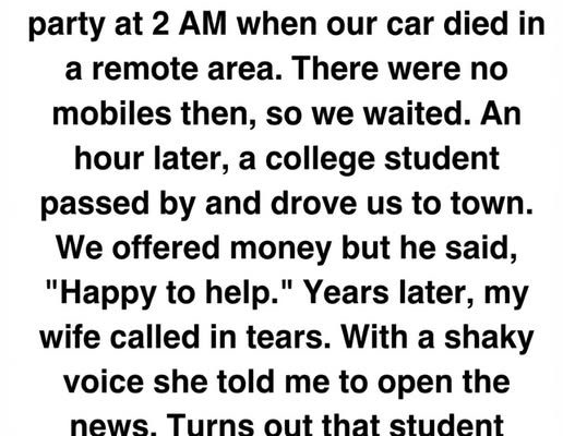 My wife and I were returning from a party at 2 AM when our car died in a remote area. There were no mobiles then, so we waited. An hour later, a college student passed by and drove us to town. We offered money but he said, “Happy to help.” Years later, my wife called in tears. With a shaky voice she told me to open the news. Turns out that student— had gone on to do something extraordinary. His name appeared in the headline of a national article announcing that he had just received an international humanitarian award.