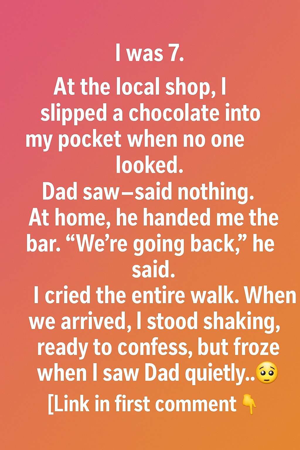 I was 7.At the local shop, I slipped a chocolate into my pocket when no one looked.Dad saw—said nothing.At home, he handed me the bar. “We’re going back,” he said.I cried the entire walk.