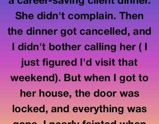 I skipped my mom’s 60th for a career-saving client dinner. She didn’t complain. Then the dinner got cancelled, and I didn’t bother calling her (I just figured I’d visit that weekend). But when I got to her house, the door was locked, and everything was gone. I nearly fainted when the neighbor