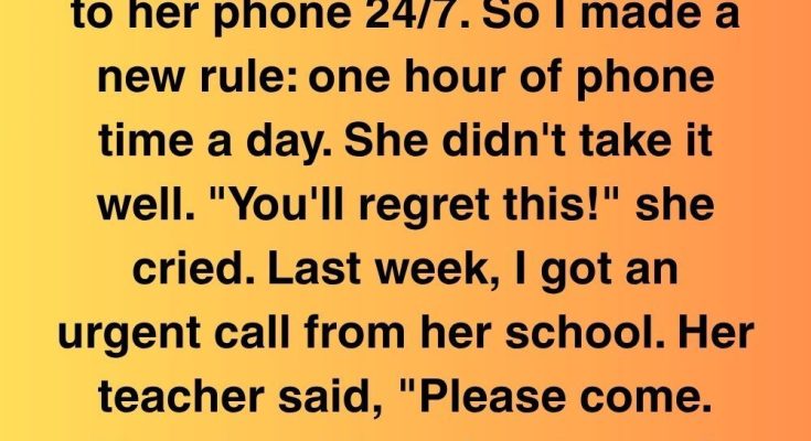 My teenage daughter Mina is glued to her phone 24/7. So I made a rule: one hour of phone time a day. She didn’t take it well. “You’ll regret this!” she cried. Last week, I got an urgent call from her school. Her teacher’s voice cracked: “Please come. Your daughter… we need to talk in person.” I drove, anxious, thinking she’d caused trouble—but something about her voice felt different.