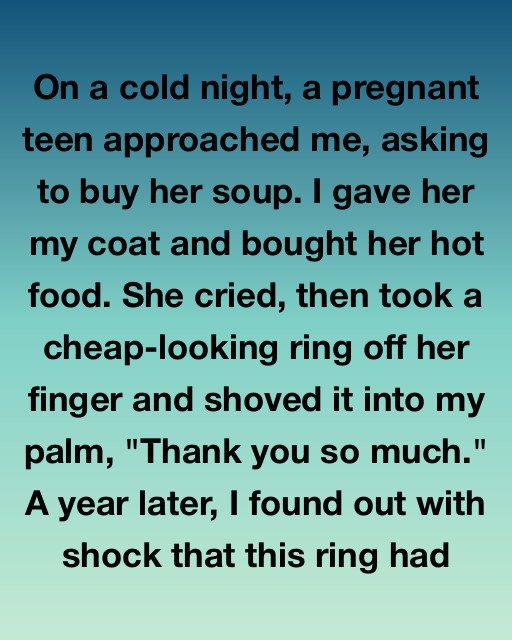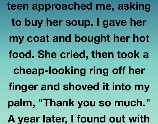 I blinked. “Uh… from a girl. About a year ago. She was pregnant and needed food. I bought her soup. She gave me the ring.”