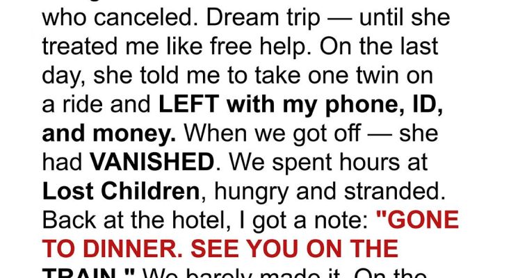 She’d taken off with my essentials, leaving me alone to care for a sugar-crazed ten-year-old. At the hotel, she’d checked in and left a note: “Gone to dinner. See you on the train.” No apology, no concern — just abandonment.