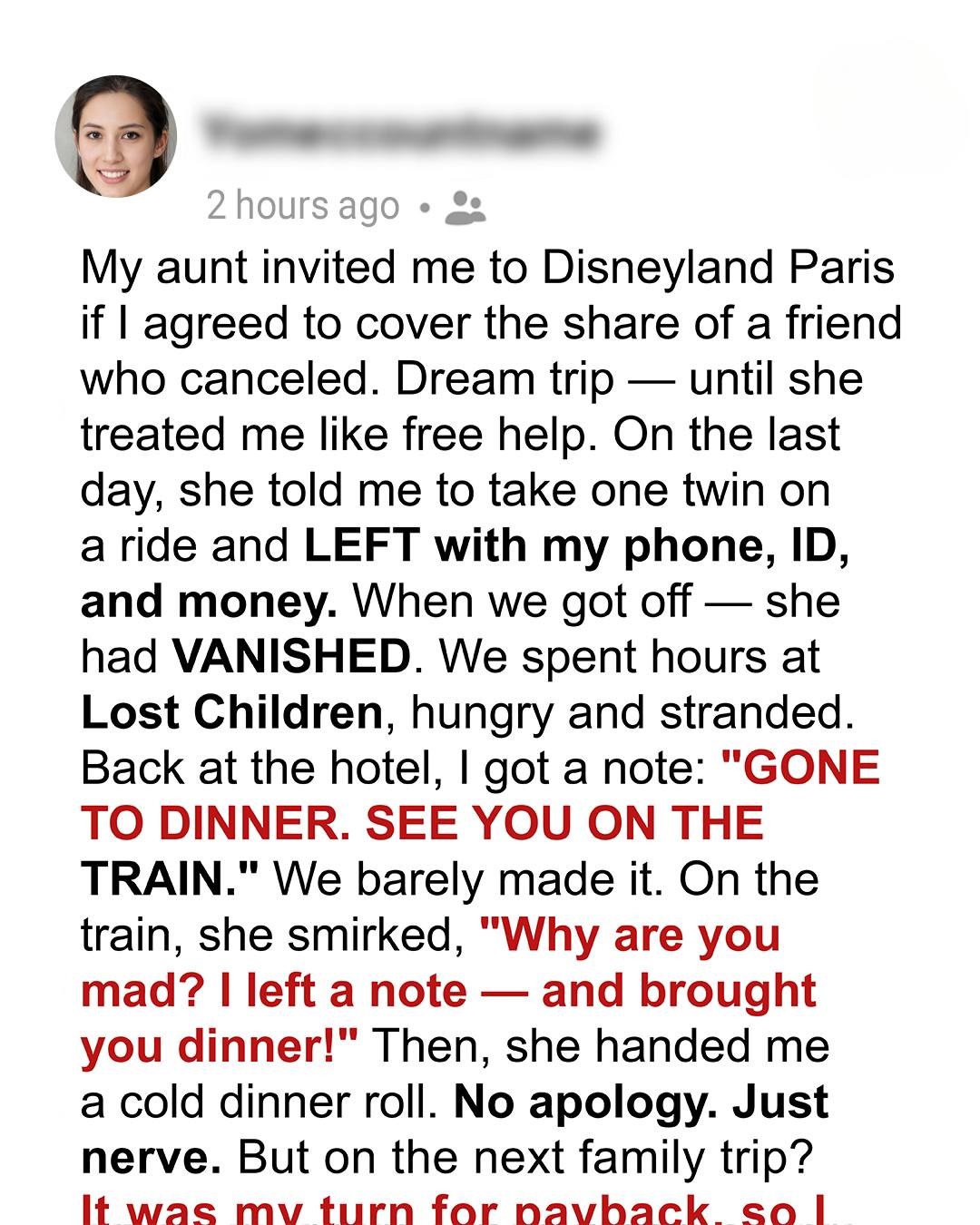 When my aunt invited me on a last-minute Disneyland trip, I thought it was a nice surprise — until she vanished with my ID, phone, and money, leaving me stranded with one of her kids in a foreign country. By the time we boarded the train home, I had already planned my revenge. The trip was supposed to be a birthday celebration for her twins, but she treated me like a babysitter while ignoring us.