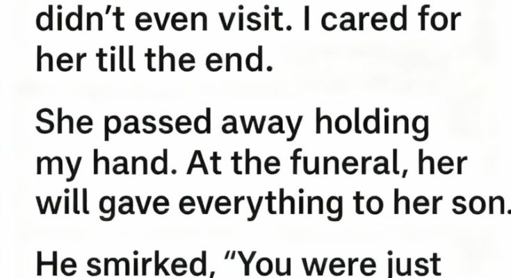The funeral came quickly, filled with formal words and distant faces. Her son arrived late, confident and untouched by grief. When the will was read, everything—her home, savings, and keepsakes—was left to him. I felt no anger, only a quiet acceptance. As people gathered afterward, he leaned toward me with a careless smile and made a remark that stung more than I expected, reducing months of care to something transactional. I said nothing. Some moments don’t deserve a response. I left the service believing that love isn’t measured by what you receive, but by what you give without expectation.