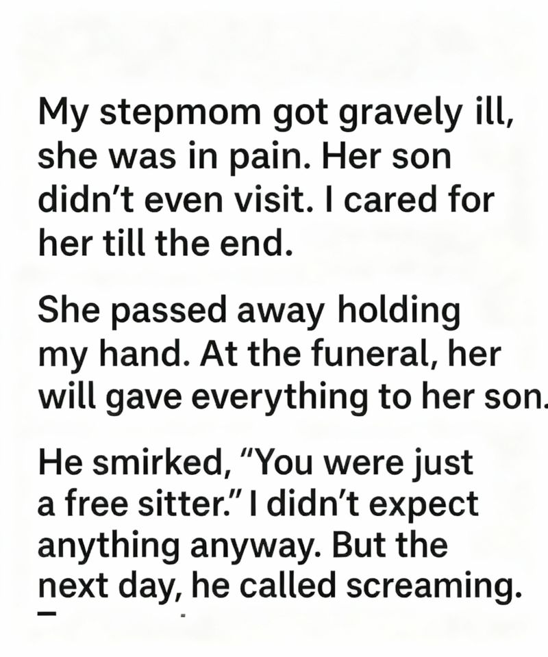 When my stepmother fell ill, it happened quietly, the way life sometimes unravels when no one is paying attention. The doctors used careful words, but her pain spoke louder than any diagnosis. Her son lived only a few towns away, yet weeks passed without him coming. At first, I told myself he was busy, overwhelmed, or afraid. So I stepped in. I cooked, cleaned, managed medications, and sat beside her bed through long nights when sleep refused to come. We talked about small things—recipes she loved, memories from before sickness changed everything. In those moments, she wasn’t my stepmother anymore. She was simply a woman who didn’t want to be alone.
