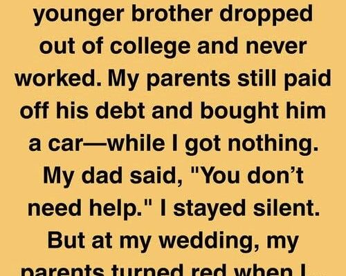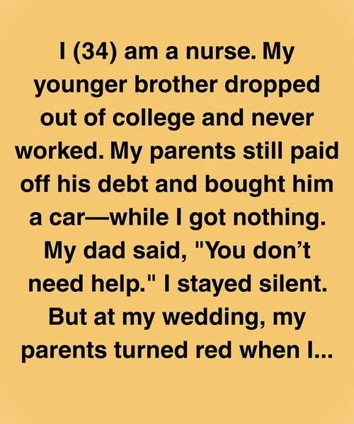 I’m a 34-year-old nurse, and growing up, it was always clear my younger brother came first. He dropped out of college, never worked, yet my parents paid his debts and even bought him a car. When I struggled through nursing school—working two jobs just to survive—my father told me, “You don’t need help.” I learned to stay quiet and carry my burdens alone.