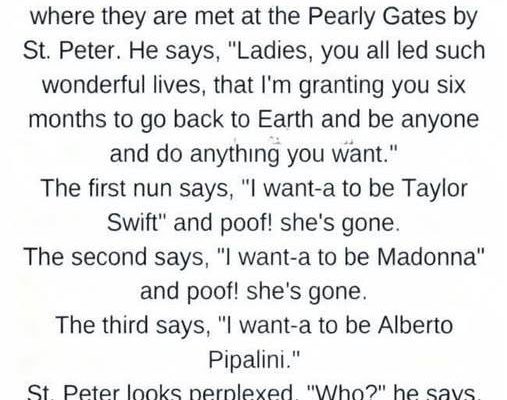 “I want-a to be Alberto Pipalini,” the third nun said softly. St. Peter blinked. He flipped through his records, checked a few heavenly databases, and scratched his head. “I’m sorry, sister,” he said gently, “but I don’t recognize that name. Is he a singer? An artist? A world leader?” The nun smiled wider and calmly pulled out a small newspaper clipping she had somehow brought with her. She pointed to a headline that read: ‘Local Man Alberto Pipalini Named Happiest Person Alive.’ The article explained that Alberto was known not for fame or fortune, but for living a simple, joyful life—running a small family business, laughing often, helping neighbors, and never taking things too seriously.