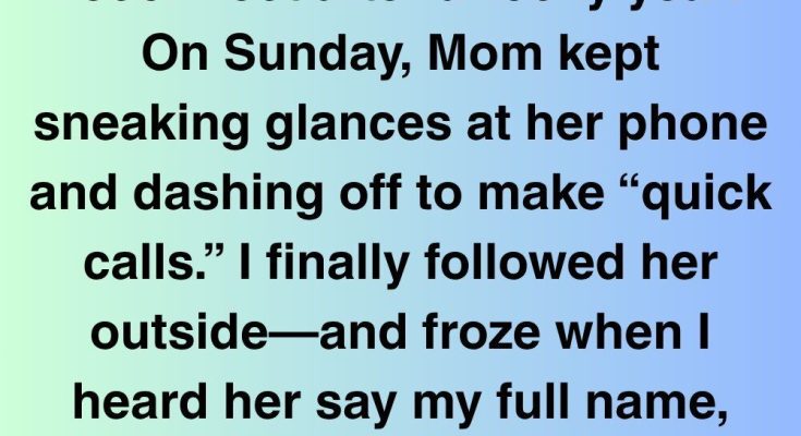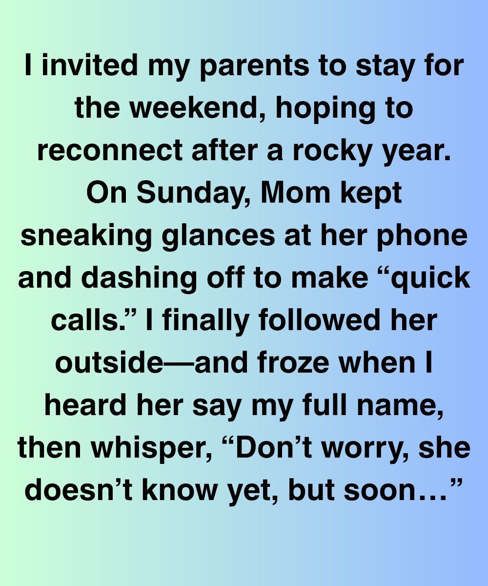 She didn’t hear me. She paced near the back gate, coat open, phone pressed close. I backed away, heart pounding. Were they planning something—an intervention, my finances, my divorce? Inside, I tried to act normal over coffee with Dad, but her whispered words—“She doesn’t know yet”—echoed in my mind all day. That night, I didn’t sleep. Mom had been acting strange all weekend—asking about my schedule, scanning the house like taking inventory. By Monday, I finally asked, “Who were you talking to yesterday?” She brushed it off, saying it was just an old friend. I didn’t believe her.