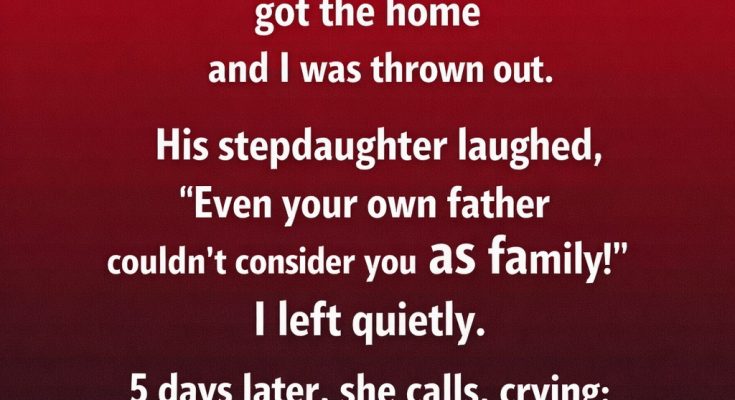 Grief has a way of arriving quietly and rearranging everything. When my father passed away, I expected sadness, memories, and maybe a sense of closure. What I did not expect was to be left with nothing—not even a place to stand. His home, the one I grew up visiting on weekends, was handed over to his stepchildren, and I was asked to leave with little explanation. The words spoken that day stayed with me far longer than the boxes I carried out. I didn’t argue or plead. I simply gathered what I could, nodded once, and walked away, choosing silence over bitterness because I had already lost enough.