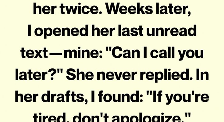 There was no reply beneath it. Just that one line, hanging there. I remembered the moment I sent it—rushing out the door, promising myself I’d call after dinner, after work, after life slowed down. It never did. She never replied.