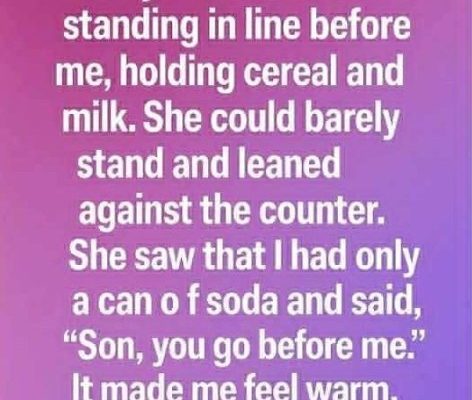 An elderly woman stood in front of me in line. She appeared to be well into her eighties, holding only a small box of cereal and a carton of milk. Each movement seemed careful, as if balance and effort were required simply to stand. She rested lightly against the counter and took a slow breath. When she noticed that I was carrying just one can of soda, she turned, smiled warmly, and said, “Please, go ahead of me.”