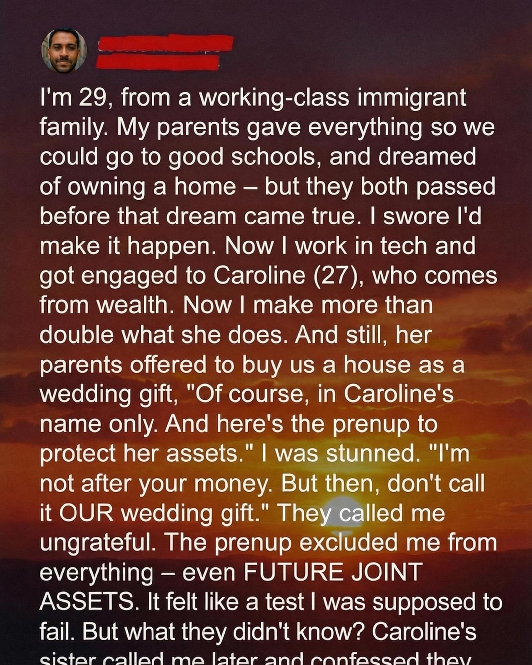Years later, that promise led me into a career in technology, where persistence slowly turned into stability. I met Caroline during that time, and we built our relationship on shared values, humor, and respect. She came from a background very different from mine, one where security was expected rather than earned. When we got engaged, I felt proud of how far I had come—not because of money, but because I had built something meaningful through effort. I never measured our relationship in numbers, so when her parents offered to buy us a house as a wedding gift, I was initially touched by the gesture.