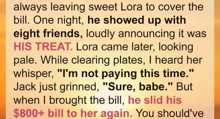One evening, Jack arrived with a group of friends, announcing loudly that dinner was “on him.” The energy at the table was confident and carefree. When Lora arrived later, her expression told a different story. She looked tired, distracted, as though she had already lived through the night before it truly began. As I cleared plates, I overheard her quietly say she wasn’t paying this time. Jack smiled easily and brushed it off with casual reassurance. But when the check came, he slid it back toward her, just as he had before. The number was high, and her face reflected a mix of shock and resignation that stayed with me long after I walked away.