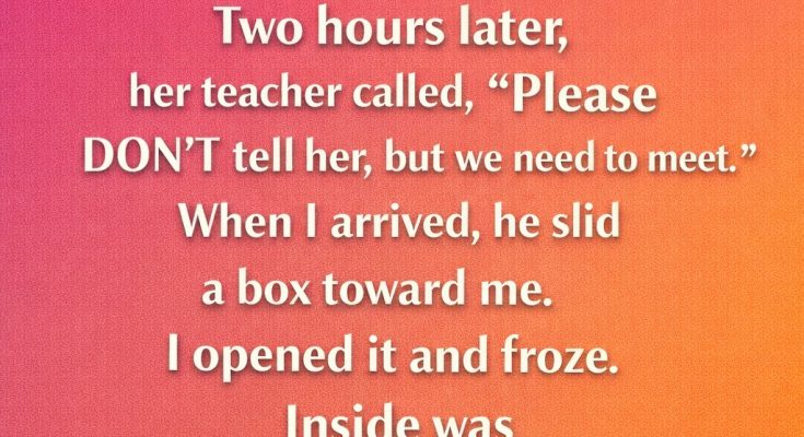 Two hours later, her teacher called. His tone was calm but deliberate, the way adults sound when they’re trying to protect a child’s dignity. “Please don’t tell her,” he said, “but could you come by the school?” When I arrived, he led me to a small room with children’s art taped along the walls. He didn’t sit. Instead, he slid a plain cardboard box across the table toward me, as if it were heavier than it looked. “Open it,” he said gently. I lifted the lid and felt my chest tighten—not with fear, but with recognition.