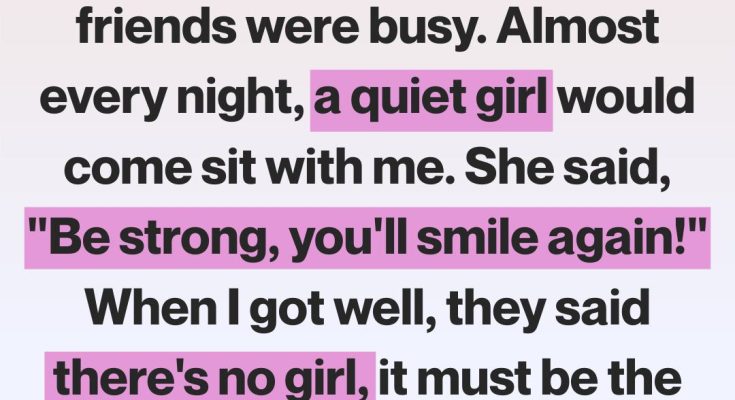 She was quiet, maybe thirteen or fourteen, with dark hair she tucked behind her ears and eyes that seemed older than her face. She never said much. She would pull a chair close to my bed and sit there, hands folded in her lap, as if she belonged. I couldn’t speak, couldn’t ask who she was or why she came, but somehow she understood. She’d lean in and whisper softly, careful not to disturb the room.