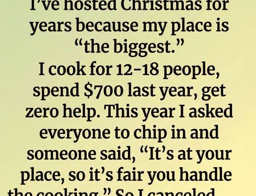 As this Christmas approached, something changed. I realized hosting itself wasn’t the problem—it was carrying the entire weight alone. For the first time, I spoke up and suggested everyone contribute, whether by bringing food, sharing costs, or helping in the kitchen. The room went quiet. One comment lingered: since it was my house, it made sense that I did the cooking. That’s when I realized how invisible my effort had become.