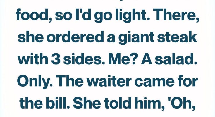 The moment we sat down, I knew this night wasn’t going to be what she promised. She ordered like it was a celebration—one of the largest steaks on the menu, cooked medium-rare, plus three sides: truffle mashed potatoes, creamed spinach, and grilled asparagus. She added a glass of wine without even glancing at the price.