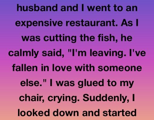 David was still talking, explaining his need for “space” and how he’d “already talked to a solicitor,” but I wasn’t listening anymore. I was fixated on the knife in my hand, the one I’d been ready to use to cut my fish. It was then that I looked down and started laughing through my tears—a hysterical, broken sound that drew a quick, concerned glance from David.