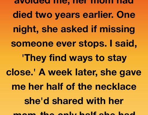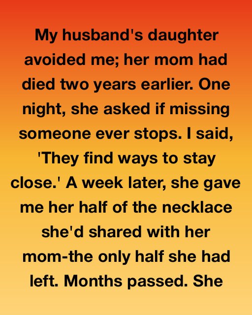 A week later, she came into the kitchen while I was making tea. She didn’t say a word, but she reached into her pocket and pulled out a small, tarnished silver charm. It was half of a heart, the kind that snaps together with another piece to form a whole. She gave me her half of the necklace she’d shared with her mom—the only half she had left. The other half had been buried with Sarah two years ago.