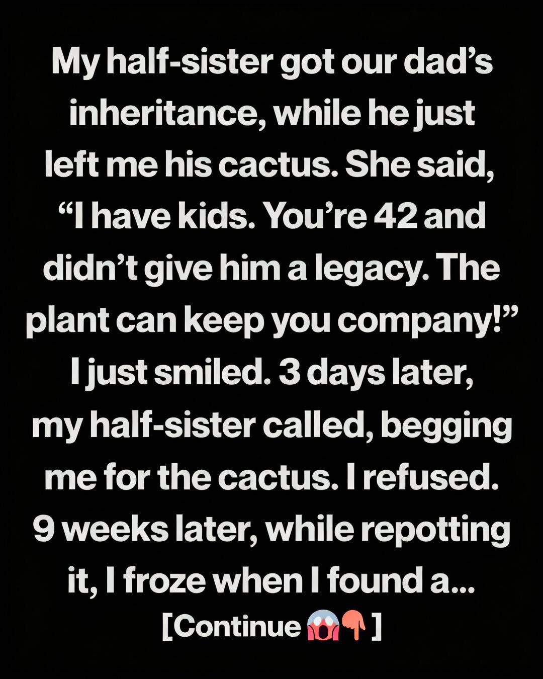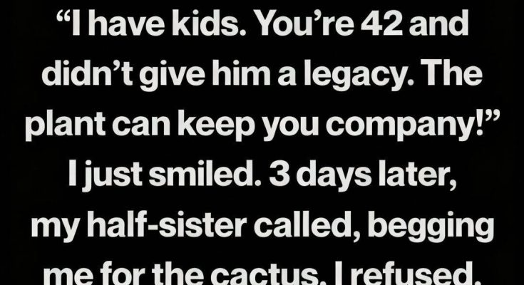 The same cactus that had sat by his living room window for decades—awkwardly shaped, duller than any plant you’d choose on purpose. My half-sister laughed. Not cruelly, just dismissively. She said she had children to think about. Real responsibilities. Real needs. At forty-two, she added, I was surely fine with something small.