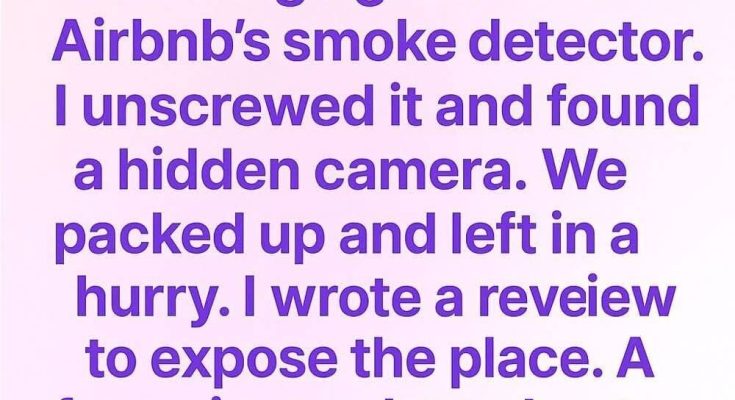 When my wife noticed a tiny blinking light on the smoke detector of our Airbnb, she froze. “Hey… does that look normal to you?” she whispered. At first, I brushed it off as a battery indicator—until I saw it too, blinking rhythmically. I climbed onto the bed, unscrewed the cover, and my stomach twisted. Inside was a tiny black lens. A hidden camera. My wife gasped, “Oh my God—they’ve been watching us.”