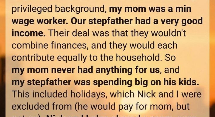 My stepfather, meanwhile, had a comfortable income and two children of his own, Cleo and Emma. From the start, my mom and stepfather agreed to keep their finances separate, contributing equally to the home. On paper it seemed fair, but in practice, it meant my mom stretched herself thin while my stepfather maintained a lifestyle that reflected his higher income.