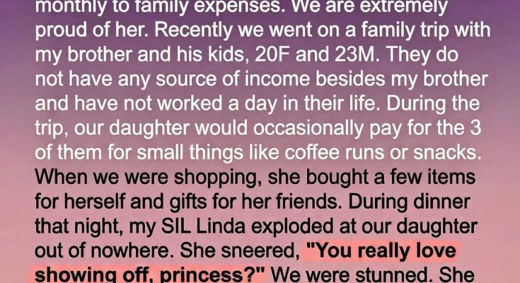 The tension surfaced during what was meant to be a simple family trip. While shopping and walking around together, the daughter paid for a few coffees, snacks, and modest items without ceremony. She bought small gifts for friends back home, the kind of souvenirs people pick up without a second thought. To her, it was just kindness and planning ahead. But to someone else at the table that evening, it looked different. Words spoken in frustration cut through the room, turning an ordinary dinner into a moment that lingered far longer than the meal itself. The accusation wasn’t about spending—it was about comparison, insecurity, and unspoken resentment.