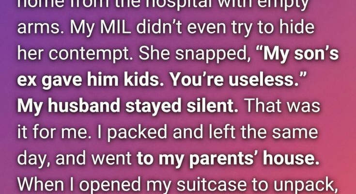 When the comment was spoken—careless and cruel—it felt heavier than the suitcase she packed that same day. Her husband said nothing, and that silence spoke louder than any insult. She left without an argument, choosing distance over dignity lost. At her parents’ home, she expected exhaustion to overtake her, but sleep would not come. As she unpacked her things, her hands paused when she noticed unfamiliar papers tucked carefully at the bottom of her bag. Three photographs and a legal document rested there, placed deliberately, as if waiting for her to find them.