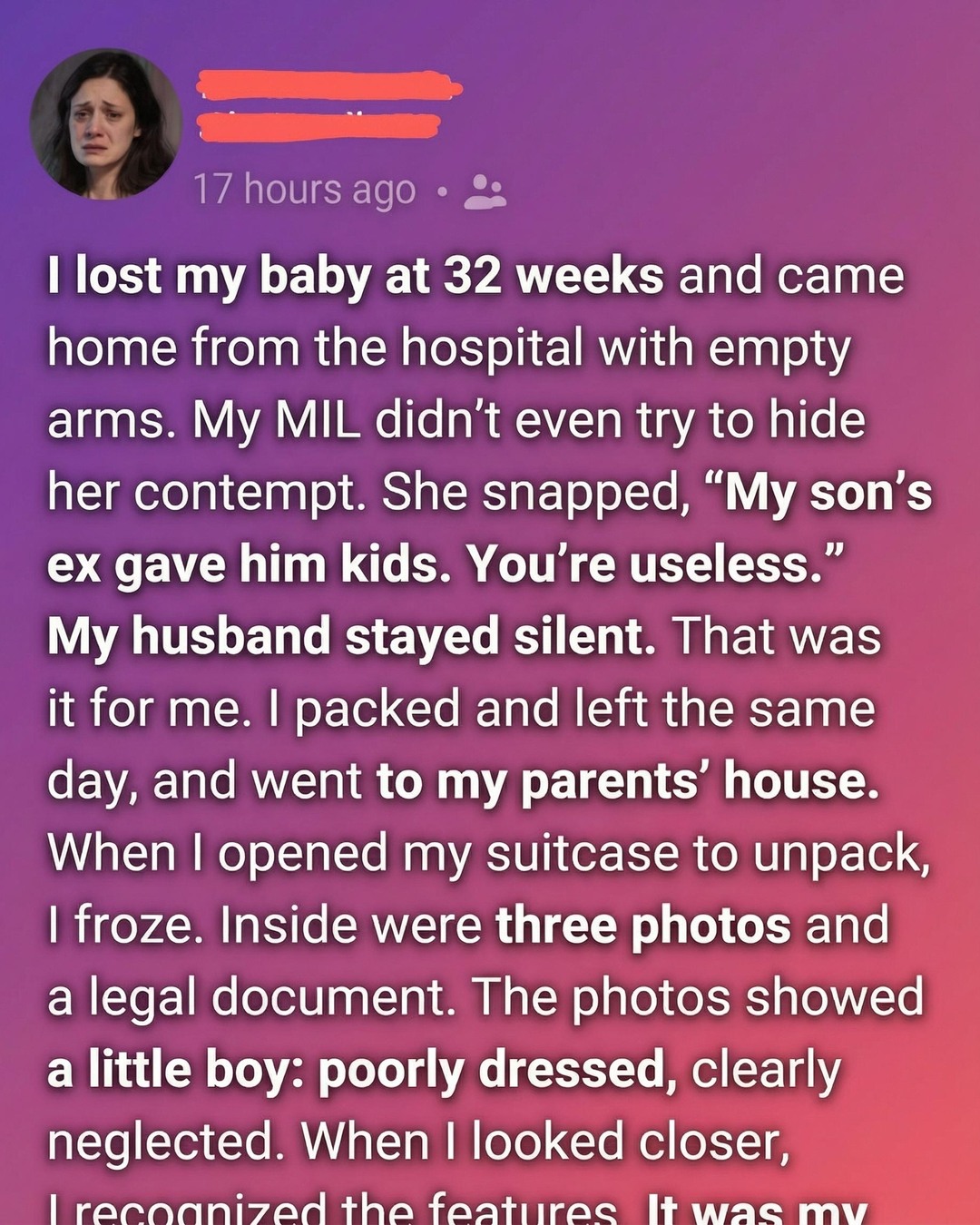 The images showed a young child standing in worn clothes, his expression serious beyond his years. There was nothing dramatic about the pictures—no visible harm, just quiet neglect that spoke through details. As she studied his face, something stirred within her. The resemblance was undeniable. The document explained what words could not: the child was connected to her husband’s past, a responsibility long ignored and hidden. The shock did not come with anger at first, but with clarity. The cruelty she had faced suddenly made sense, though it did not excuse it.