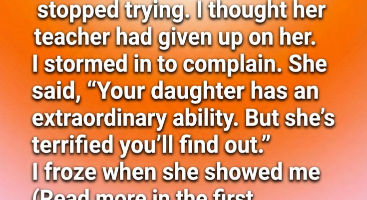 When I finally sat across from her teacher, I expected defensiveness. Instead, she looked calm—almost relieved. Before I could finish listing my concerns, she stopped me gently and said, “Your daughter has an extraordinary ability. But she’s terrified you’ll find out.” Her words stunned me. Terrified? Of what? The teacher opened a folder and slid it across the desk. Inside were not test scores, but pages filled with sketches, patterns, stories written in the margins of assignments, and complex problem-solving notes she had done privately after class. “She finishes her work quickly,” the teacher explained, “then hides what she’s really doing. She’s afraid being different will disappoint you.”