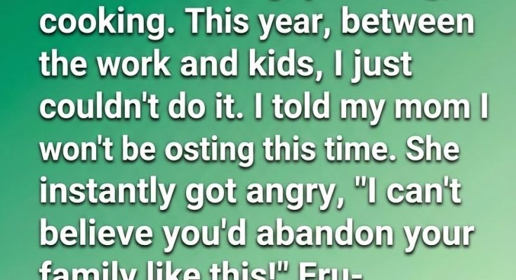 When I told my mom I wouldn’t be hosting this year, I hoped for understanding. Instead, the conversation turned sharp. She accused me of letting everyone down, of “abandoning the family,” as if one exhausted decision erased years of effort. Her words hit harder than I expected, stirring guilt I thought I’d outgrown. Frustrated and overwhelmed, I ended the call sooner than I should have. I spent the rest of the night replaying it, wondering how caring for myself had somehow become a betrayal.