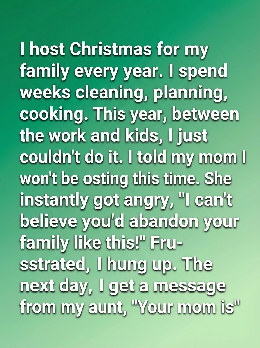 The next morning, a message from my aunt appeared on my phone. It wasn’t dramatic or angry. It simply said my mom was upset, not because Christmas was canceled, but because she felt scared of change. That message shifted something in me. I realized how many years I had quietly absorbed responsibility so others wouldn’t have to adjust. Hosting had stopped being a shared tradition and become a test of loyalty. And for the first time, I questioned why my well-being was always the price of keeping everyone else comfortable.