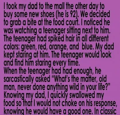I took my dad to the mall the other day to buy some new shoes (he is 92). We decided to grab a bite at the food court. I noticed he was watching a teenager sitting next to him. The teenager had spiked hair in all different colors: green, red, orange, and blue. My dad kept staring at him. The teenager would look and find him staring every time. When the teenager had had enough, he sarcastically asked, “What’s the matter, old man, never done anything wild in your life?” Knowing my dad, I quickly swallowed my food so that I would not choke on his response, knowing he would have a good one.