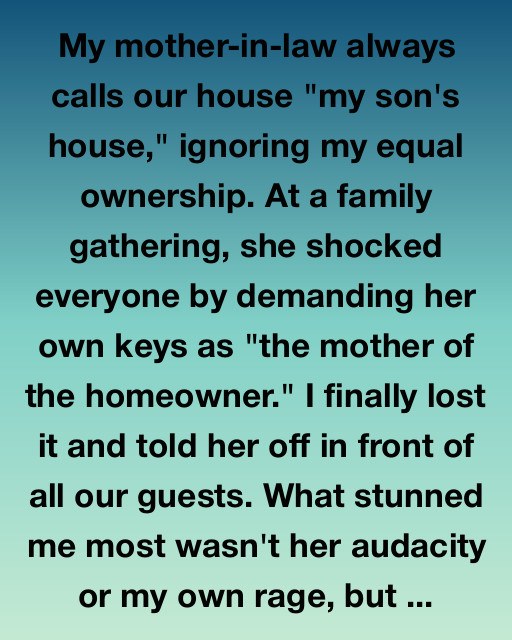 My mother-in-law always calls our house “my son’s house,” ignoring my equal ownership. At a family gathering, she shocked everyone by demanding her own keys as “the mother of the homeowner.” I finally lost it and told her off in front of all our guests. What stunned me most wasn’t her audacity or my own rage, but the silence that followed—my husband didn’t say a word.